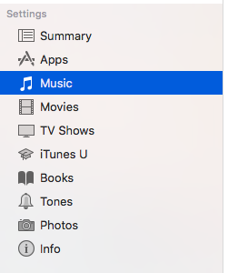From the list under settings on the left side of the itunes window, click the type of content that you want to sync or remove.